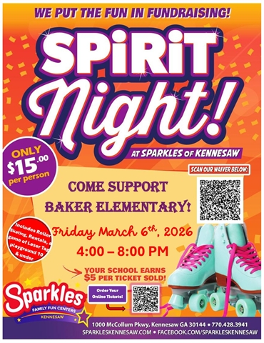 Come support Baker Elementary's fundraiser by purchasing a $15 Spirit Night Ticket! Every purchase helps towards raising money for the school & includes skating admission, skate rentals, and game of laser tag (kids 11 & older) or skating admission, skate rentals, game of laser tag, & access to the playground (kids 10 & younger). See YOU at the rink!